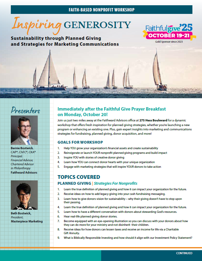 Join us at the Faithward Advisors office at 275 Hess Boulevard for a REPEAT of the dynamic workshop, with fresh inspiration for planned giving strategies, whether you’re launching a new program or enhancing an existing one. Plus, gain expert insights into marketing and communications strategies for fundraising, planned giving, donor acquisition, and more!